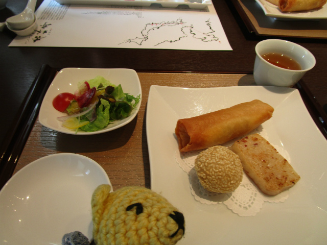ミニサラダ、点心6種(春巻き、胡麻団子、大根餅、蟹焼売、海老餃子、小籠包)