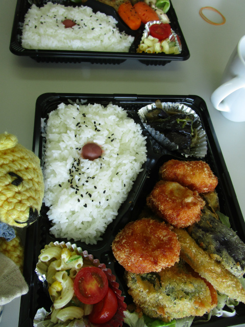 先日のお昼、こはる食堂のお弁当。注文したのは帆立と季節の野菜フライ。
