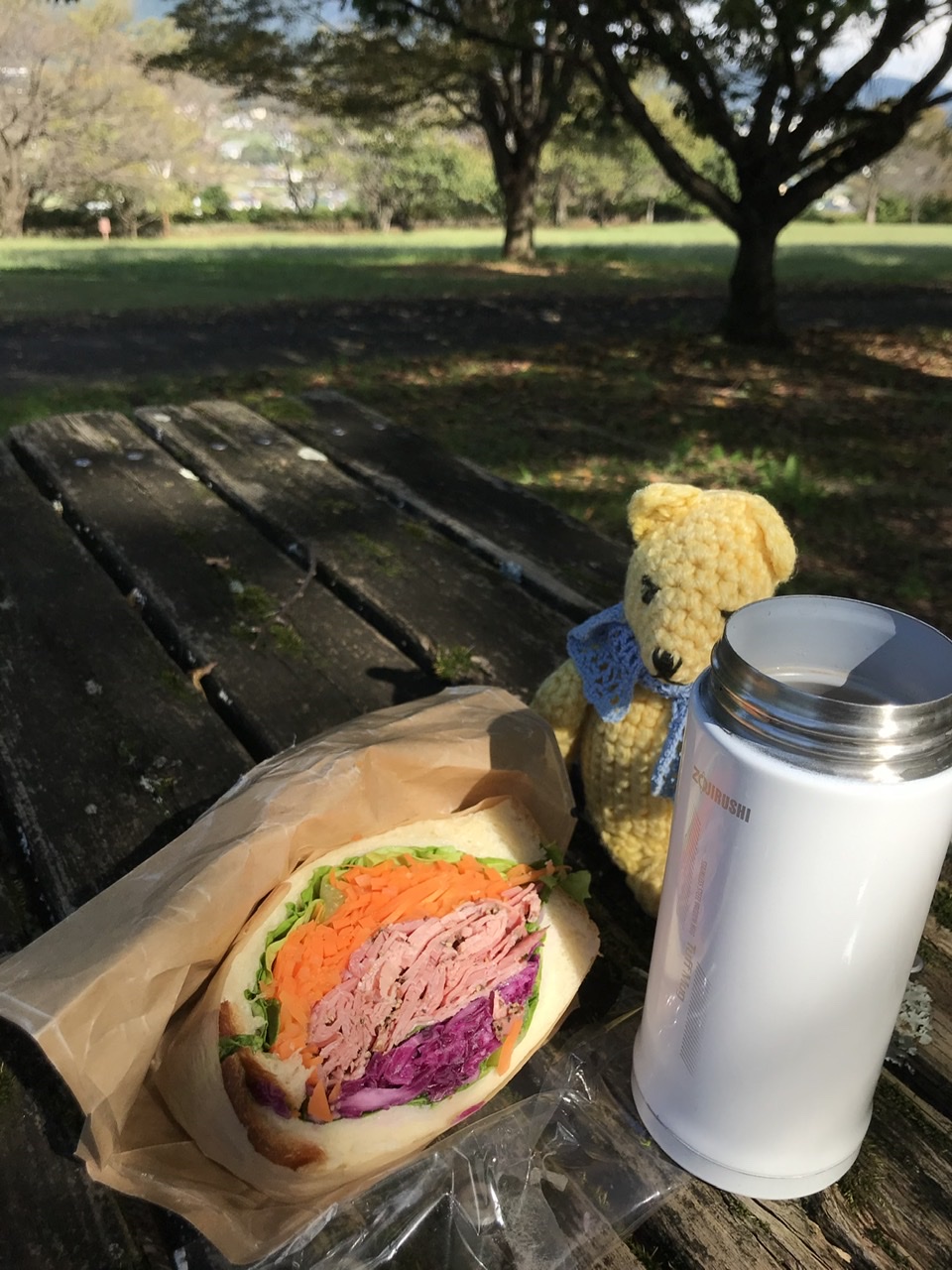 豊富にパンがある時間帯でラッキー。良い天気だったので野菜モリモリサンドを買って公園で。