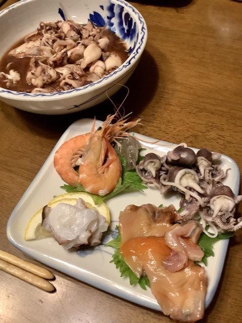 夕方チルドで届いた愛媛のお魚便。赤貝、ミミイカ、ミズイカ、蛸に海老!うんまい!