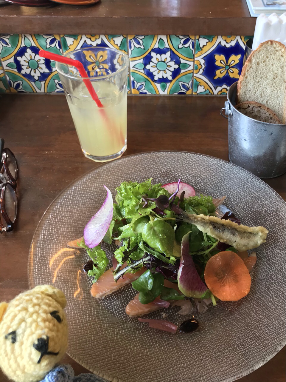 前菜のスモークサーモンカルパッチョにはヒコイワシのフリットも添えられて。