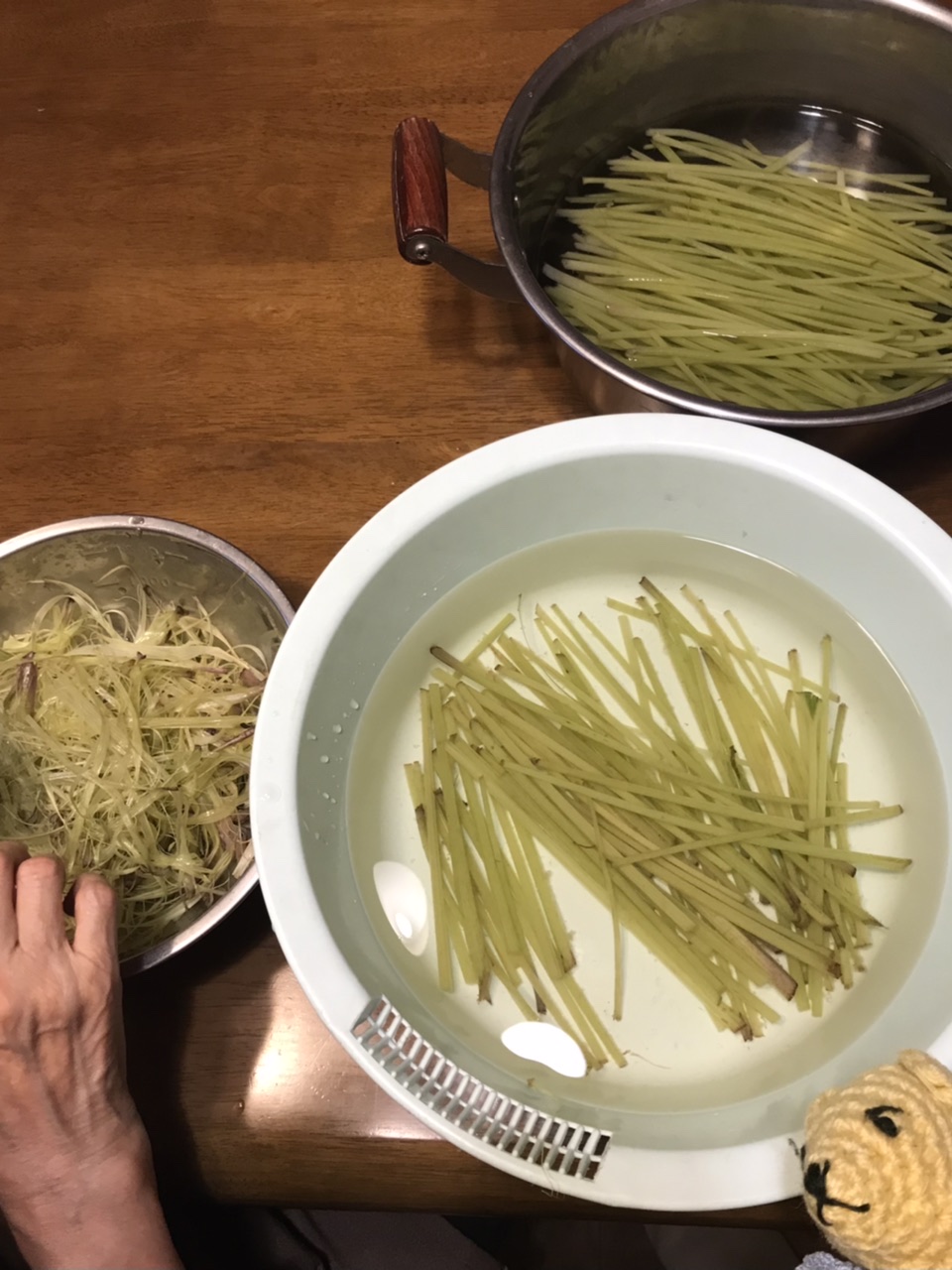皮むき作業するとなくなっちゃうくらい細めのフキ達。やわらかくて美味しそう。