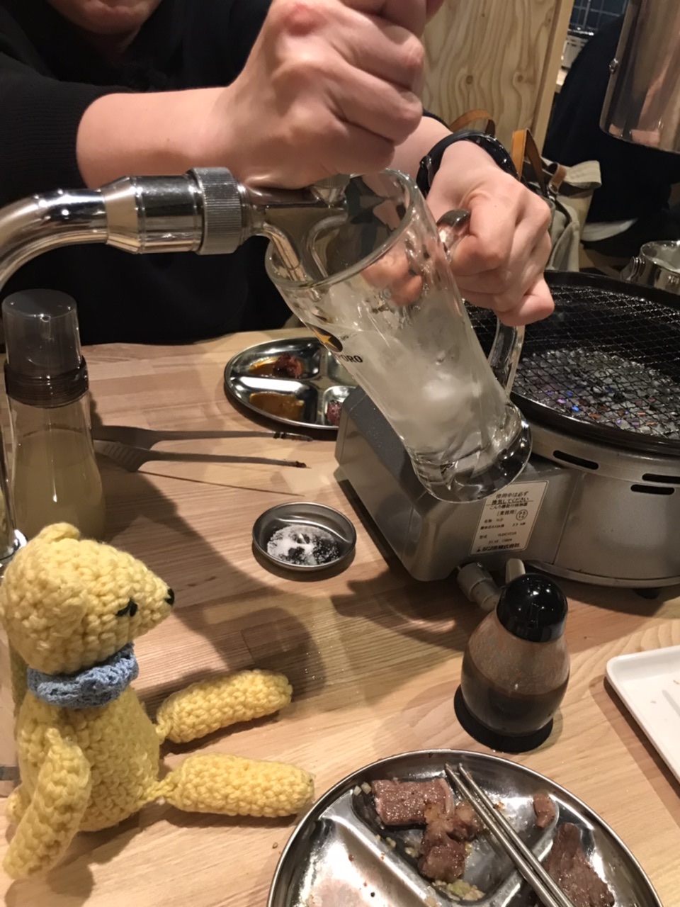 新規オープンの焼肉店、肉小屋へ。ここは全卓に樽直管でレモンサワーが飲み放題。素晴らしい。