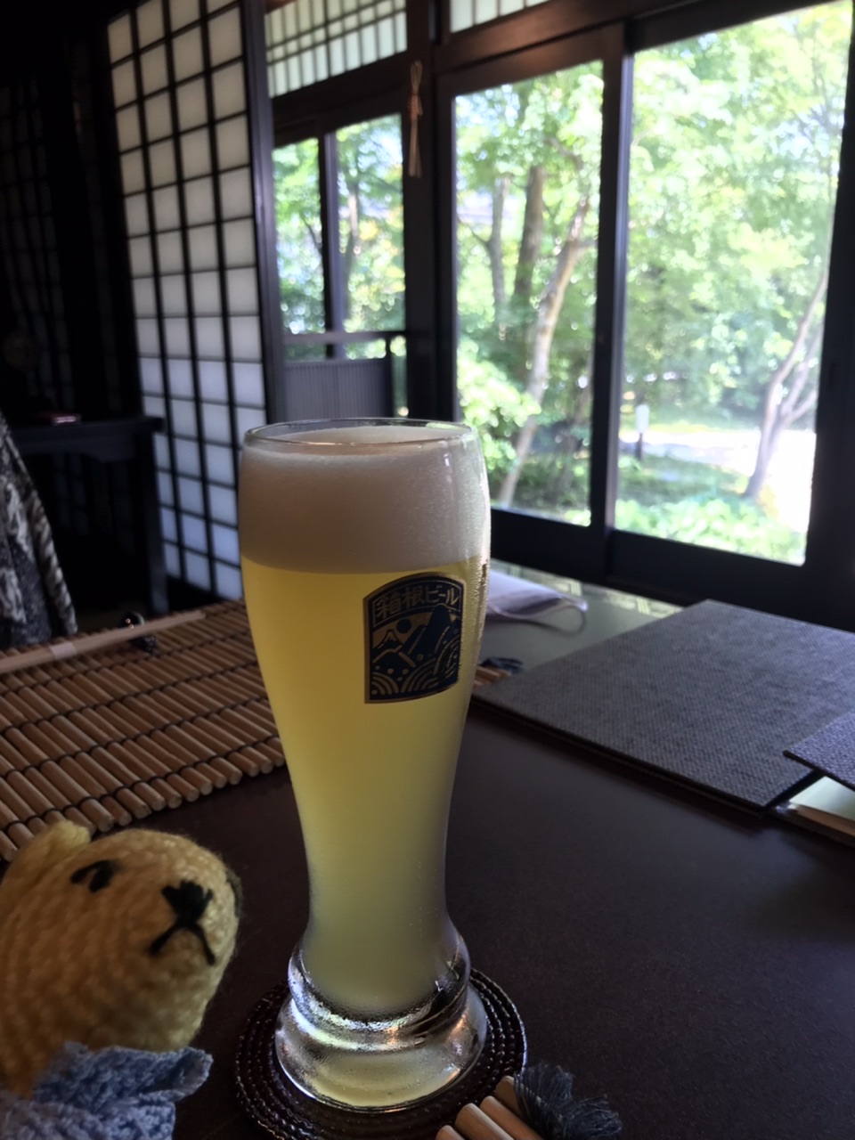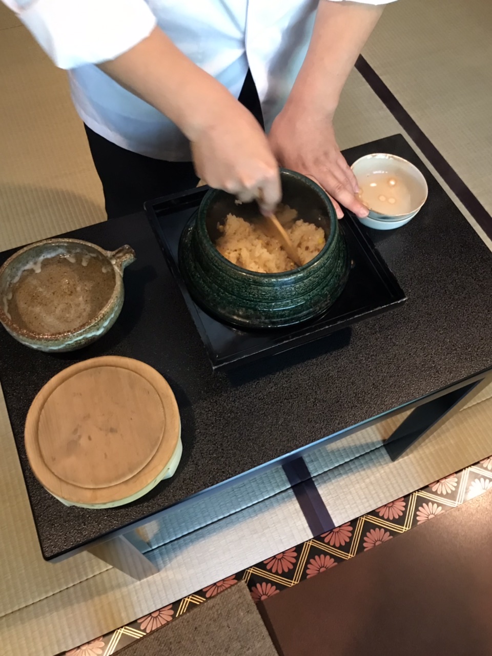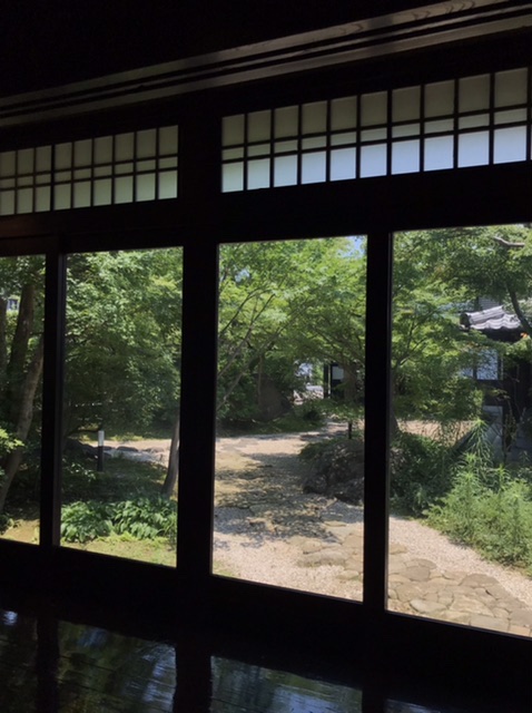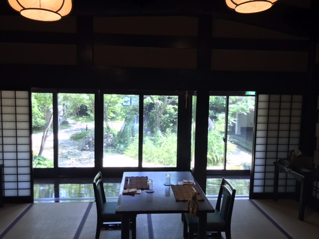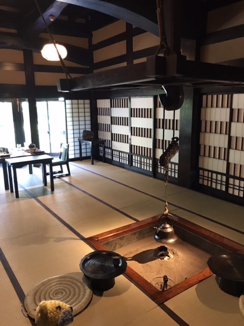 風祭の大清水、合掌造りの素晴らしい建物の広々した囲炉裏のお部屋でお昼の会席をいただく。