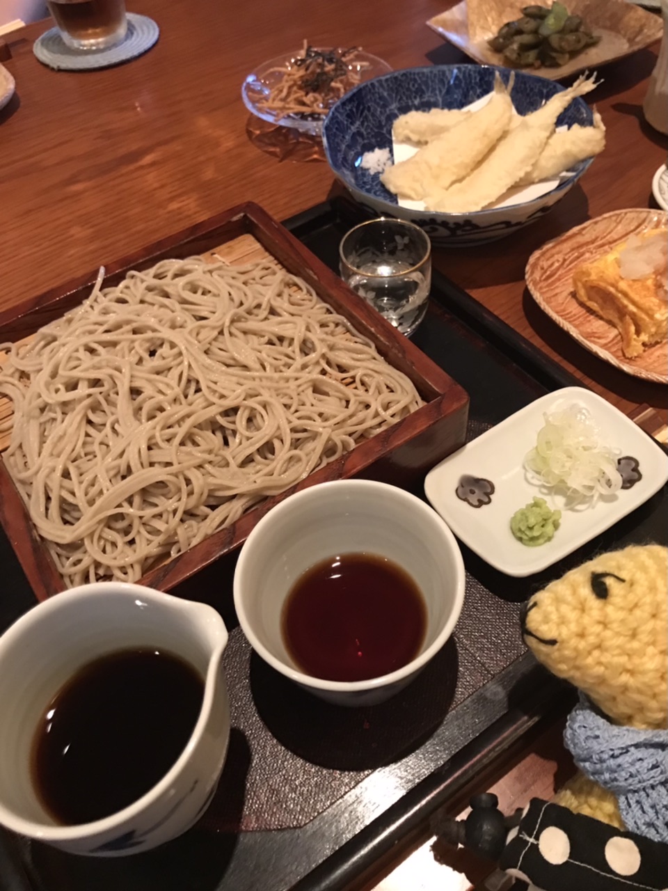 焼き枝豆醤油漬けや卵焼き、鱚天ぷらときて、作を一合をやりつつお蕎麦。蕎麦湯で〆。最高。