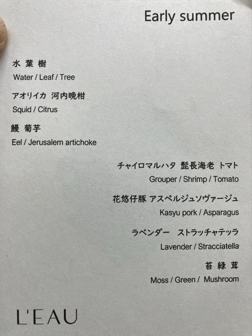 外苑前のガストロノミー"L'EAU"(ロー)で、日本の夏じたく打ち上げランチ会。